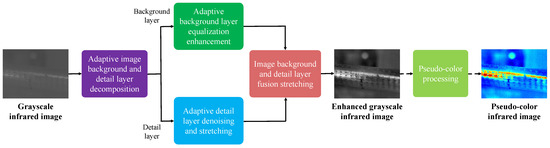 For a given grayscale infrared image of a cable, I, as shown in Figure 4, the background image is first generated through AGWGF, and is subtracted from the original image I to obtain the detail image . For the background image , it is enhanced using the improved CLAHE to obtain ; for the detail image , it is denoised and stretched using the improved ABF to obtain . Then, the enhanced grayscale thermal infrared image of the high-voltage cable is obtained by fusing and stretching and . Finally, pseudo-color processing is performed on to generate a pseudo-color thermal infrared image .
