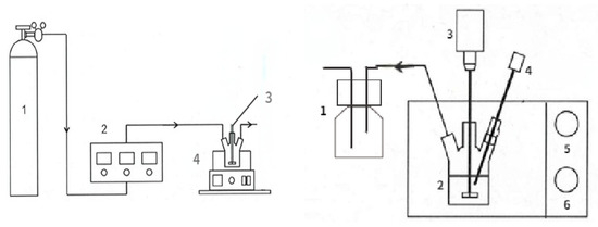 Experimental setup and procedure diagram. Absorption apparatus (left): 1 gas cylinder; 2 flow meter; 3 magnetic stir bar; and 4 magnetic stirring heating mantle. Desorption apparatus (right): 1 exhaust gas cylinder; 2 three–neck flask; 3 condenser; 4 thermocouple thermometer; 5, 6 control knobs.