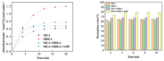 In terms of absorption performance, as shown in Figure 3 (left), at 30 °C, single MEA has a lower CO2 absorption loading, and single MDEA has a slightly faster absorption rate and, comparatively, a better absorption loading effect due to its molar mass. However, in actual experiments, the absorption amount is relatively low, with about 3.45 g of CO2 absorbed after 15 min. The blended MEA and MDEA absorbent has the fastest absorption rate in the early stages, reaching near saturation within 9 min, but has a lower ability to absorb CO2, resulting in low absorption loading. When AMP is further added, the ternary blended alkanolamine absorbent, although not as fast as the binary MEA and MDEA blend, significantly increases the absorption loading compared to the binary mixture. Experimental results show that the ternary mixture of MDEA, MEA, and AMP saturates within 15 min and has a higher total absorption loading than the single MEA component and the binary mixture, with MDEA having a strong CO2 absorption capacity. However, based on the current optimization direction to develop novel adsorbents with high CO2 absorption rates and low regeneration energy consumption [24], the single-component MDEA has high desorption energy consumption; therefore, the ternary composite absorbent with better overall capability is chosen.