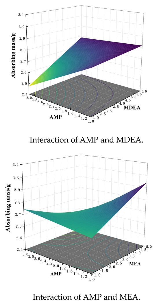 The optimal blend ratio of blended amines is determined using the response surface methodology (RSM), which allows for the simultaneous adjustment of multiple factors to obtain optimal absorption performance based on combinations of independent variables [25]. The three factors in RSM are the mass ratios of MDEA, MEA, and AMP, with the target being the amount of CO2 absorbed; due to laboratory operational constraints, the maximum value for MDEA is set at 6 and the minimum at 2; for MEA, the maximum is 5 and the minimum is 1; and for AMP, the maximum is 3 and the minimum is 1. Following software (Design-Expert Version 13) computation of different ratios of alkanolamines, experimental outcomes for absorption amounts are obtained. The software is then used to perform response surface and curve-fitting corrections, and the optimal mass ratio is determined by comprehensively comparing absorption and desorption amounts. Within the experimental range, one variable is fixed while the other two are varied to obtain a visualized response surface map as shown in Figure 4, ultimately determining the optimal mass ratio of MDEA, MEA, and AMP to be 4:5:1, with the coordinates representing the mass (g) of each substance.