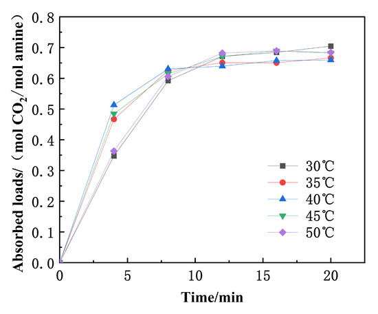 As shown in Figure 5, the absorbent has a relatively rapid rate of CO2 absorption. At the beginning of the reaction, the rate of absorption is quite distinct between different temperatures. However, as the absorption time increases, the amount of CO2 absorbed by the solvent at 30 °C steadily grows, with this temperature demonstrating a clearly better sustained absorption effect, reaching the maximum total amount within 20 min, and achieving the highest absorption loading.