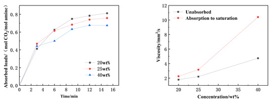 The concentration of the amine solution affects the viscosity of the absorbent; the higher the viscosity, the poorer the fluidity of the solution, and the fewer the reactive molecules involved in absorbing CO2, leading to a diminished CO2 absorption capacity. As shown in Figure 6(left), with increasing concentration, there is a marked increase in absorbent viscosity. When the concentration of the absorbent is at 20 wt%, the viscosity is the lowest, and the mass transfer capability is stronger, resulting in greater reactivity in the CO2 absorption reaction. As shown in Figure 6(right), after 15 min of reaction, the 20% concentration of the blended alkanolamine solution has the highest CO2 absorption loading. The absorption capacity decreases progressively with increasing concentration.