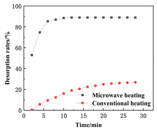To compare the desorption performance of absorbents under traditional heating and microwave–assisted desorption, the same reaction conditions were established at 95 °C. Conventional electrical heating mantles were used to thermally assist the desorption of alkanolamine-rich solutions in flasks [26]. This was compared to desorption rates of CO2 in a microwave reactor. The results, as illustrated in Figure 7, show that the desorption rate of the absorbent is significantly affected by the heating method. Under equivalent temperature conditions, the volume and rate of desorption achieved through microwave heating are substantially greater than those achieved by conventional heating, indicating better desorption effects. Hence, microwave heating is more suitable for the CO2 desorption process with this formulation.