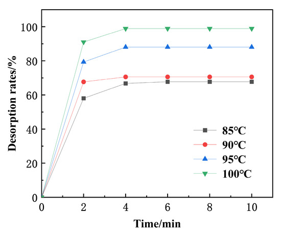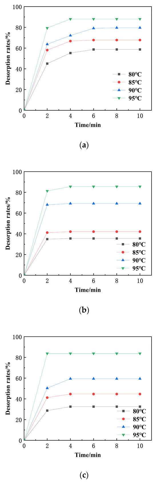 The study revealed that, at the onset of the reaction (within 2 min), the reaction proceeds swiftly. As the temperature increases, so does the desorption rate. By 4 min, the reaction is nearly complete, with desorption time being relatively short. The desorption rates for each group reach their maximum between 4 and 6 min, as depicted in the figure. At 85 °C, the desorption rate reaches its maximum of 67% in 6 min. At 90 °C, the desorption rate is slower, reaching 72% at four minutes and a maximum of 79% at 6 min. Higher temperatures correspond to faster desorption rates, with equilibrium reached within 4 min at both 95 °C and 100 °C. At 95 °C, the desorption rate reaches 89%, and at 100 °C, it reaches 99%, nearing complete desorption. However, higher temperatures result in evaporative losses of the absorbent solvent and higher energy consumption for desorption, failing to meet the objective of reducing desorption energy consumption. Therefore, 95 °C is considered the optimal operation temperature for microwave–assisted desorption.