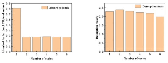 Figure 10 presents the cyclic repeatability experiment for the optimal formulation, indicating good repeatability for the formulation. During six cycles of experimentation, the CO2 absorption load of the absorbent group, after an initial decline following the first absorption, remains stable, with only minor variations in the quality of desorption over multiple cycles. At the initial stage of the cycling experiment, there was no carbon dioxide loading in the absorption lean solution, so the initial absorption was large. In the subsequent absorption process, the carbon dioxide previously remaining in the absorption solution that was not desorbed decreased the absorption of carbon dioxide by the alkanolamine solution; this phenomenon continued to appear during the cycling experiment and had a similar effect on the subsequent multiple cycles of the absorption experiments. Therefore, in the regeneration experiments, the absorption loading decreased and stabilized after the first cycle.