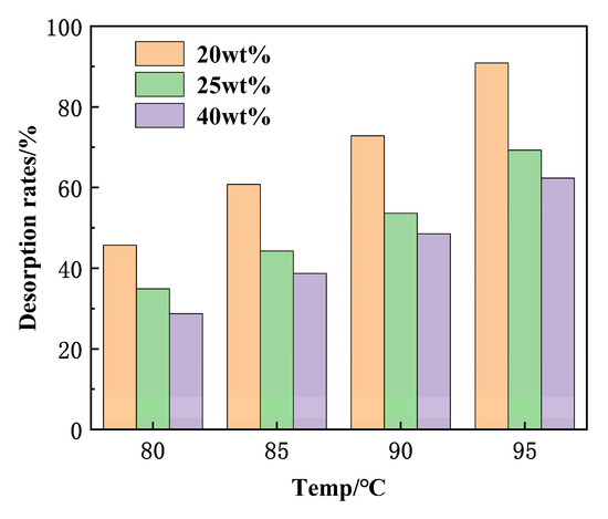 In this experiment, each group’s desorption reaction time was 10 min; however, as shown in Figure 9, rapid desorption occurs within the first 2 min. Thus, excluding time as a factor and after the reaction’s completion, the relationships between desorption concentration, temperature, and rate are assessed. The experimental results conclude that a 20 wt% alkanolamine solution exhibits the best absorption and desorption effects, followed by the 25 wt% solution, while the 40 wt% solution performs comparably to the first two concentrations in high-temperature desorption but with inferior absorption capacity. At 95 °C, the 20 wt% concentration alkanolamine solution shows the best CO2 absorption and desorption effects, with a desorption rate as high as 89%.