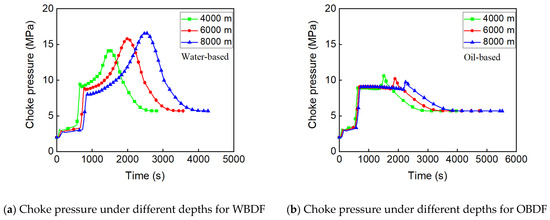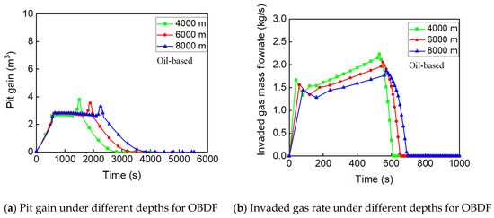 - Gas influx handling in WBDF is 75% faster than in OBDF due to free gas phase slip. The maximum choke pressure and pit volume increase with depth in WBDF but decrease in OBDF.