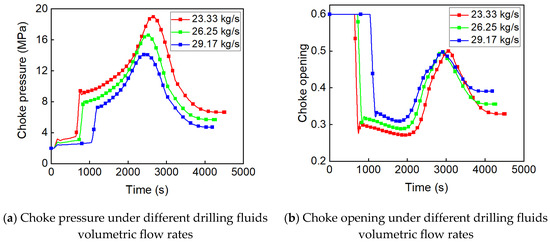 - Higher drilling fluid flow rates raise the minimum choke opening, decrease the maximum choke opening, and reduce the choke pressure.