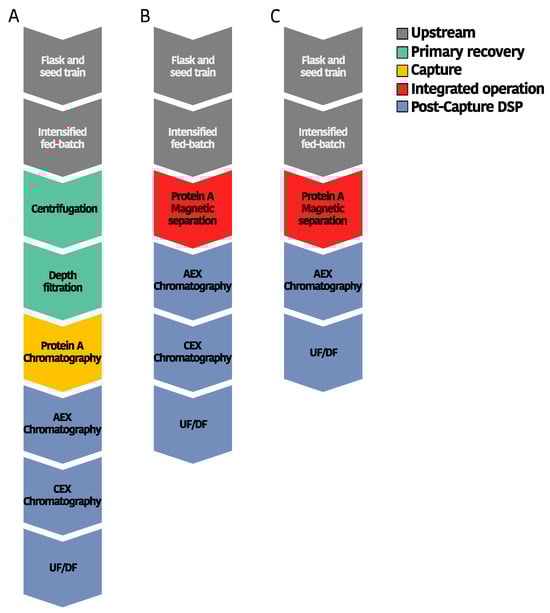 Flowsheet for the three modelled processes, (A) CHROM, (B) MAG-2, and (C) MAG-1, containing the relevant process operational steps. Note that post-capture DSP also includes two steps not depicted here that are related to viral safety (VI—low pH virus inactivation and VF—virus filtration).
