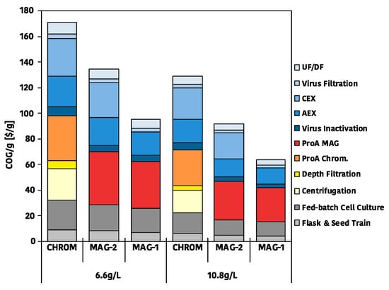 Step-related COG/g for the respective unit operations and three processes CHROM, MAG-2, and MAG-1 at two different titres.