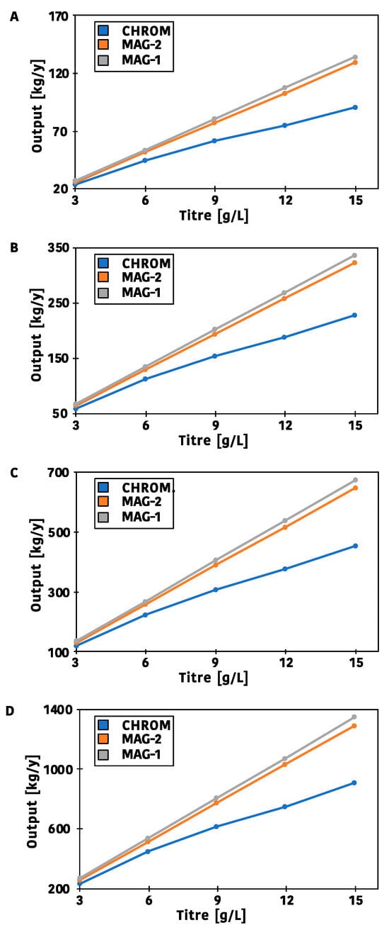 Table 2 shows the annual facility output as well as the facility output change and the changes in COGs/g and fixed capital investment relative to the traditional process (CHROM) across the processes at 500 L scale and product titres, as mentioned above. Firstly, a reduction by 5% and 17% in fixed capital costs is seen for both magnetic processes compared to the traditional process. These fixed capital costs here are only accounting for the equipment cost. Hence, the process with the lowest number of steps and equipment (MAG-1) provides the highest savings, while the MAG-2 process provides savings only at the clarification stage. Furthermore, the magnetic bead-based processes show a reduction in COGs/g ranging from 18 to 29% for the 6.6. g/L feed and 27 to 38% for the 10.8 g/L feed. Here, again, as all processes deal with the identical input from the USP, the step integration and reduction achieved by the magnetic bead-based processes are the reason for these significant improvements. This fact also resembles in the process output increase. Here, the magnetic processes show improvements of 15 to 20% and 34 to 40% for the MAG-1 and MAG-2 processes, respectively, at the modelled titres and a scale of 500 L. The reduction in unit operations with less process-related yield losses results in an overall higher total process yield, which leads to all the significant process improvements.