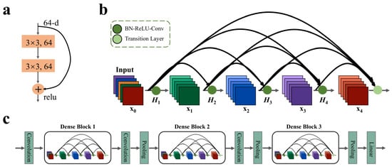 ResNet, proposed by He et al. [], solves the problem of the difficult training of deep networks, and a 152-layer neural network can be successfully trained using ResNet. As shown in Figure 2a, the residual network ResNet uses a shortcut connection to connect the input directly to the output by skipping one or more layers of the network; the shortcut module facilitates the conduction of gradients in backpropagation, which allows deeper models to be successfully trained.