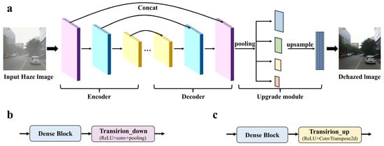 (a) DAE-DenseNet based image dehazing network, (b) encoder structure unit, (c) decoder structure unit.