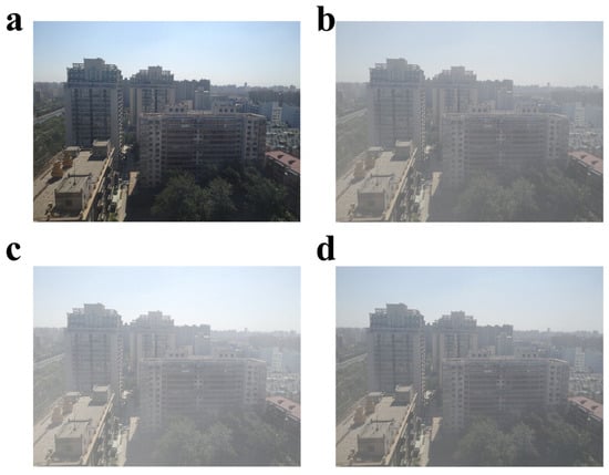 RESIDE utilizes the atmospheric scattering model to synthesize haze images, setting the atmospheric light A between [0.7, 1.0] and the scattering coefficient β to randomly select values between [0.04, 0.2], and synthesizing 10 haze images with varying blurring levels for each clear image. Thus, the RESIDE dataset contains pairs of clear and haze images, where one clear image generates multiple corresponding haze images based on different atmospheric light and scattering coefficients. Figure 4 shows a clear image and an image with fog generated by different atmospheric light and scattering coefficients.