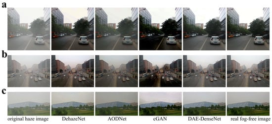 As shown in Figure 5, DehazeNet and AOD-Net utilize lightweight networks to estimate the intermediate variables of the atmospheric scattering model. However, our findings indicate that their dehazing effects lack thoroughness, often resulting in images that still exhibit residual haze. This can detract from the overall visual quality and clarity of the output images. In contrast, the cGAN-based dehazing method tends to produce an excessive dehazing phenomenon. While it effectively removes haze, it often overcompensates, leading to unnatural artifacts and a loss of detail in certain areas of the image. Compared to the aforementioned algorithms, the DAE-DenseNet model demonstrates a dehazing effect that is significantly closer to the real fog-free image. This is particularly evident in its ability to preserve color fidelity and natural textural details, which are crucial for maintaining the integrity of the original scene.