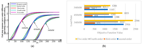 Comparison of model transformation effects under different loads and orders. (a) Step response curve comparison, (b) objective function calculation comparison.