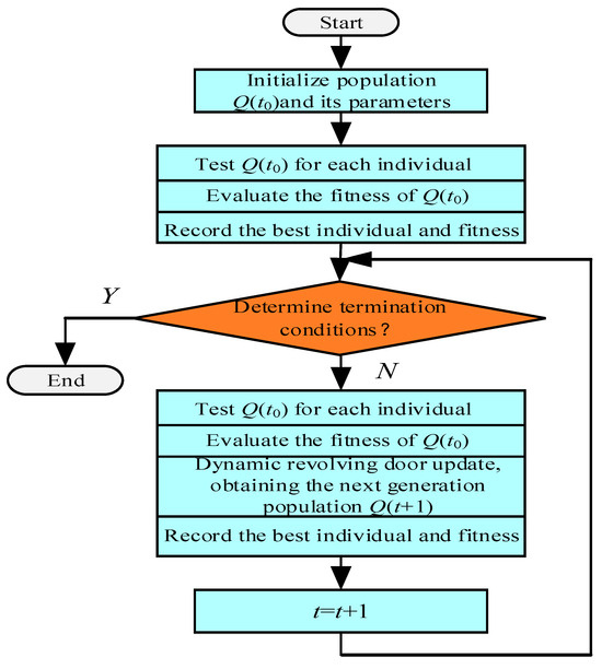 where fx and fmax are the fitness values of the current and the best individual, respectively; θmin and θmax are the minimum and maximum rotation angles; Δθ typically ranges from 0.01π to 0.05π. The smaller the difference between fx and fmax, the smaller the rotation angle, facilitating not only continuous convergence towards the optimal solution but also fine searching near the optimal solution. Based on the principles mentioned, a flowchart of the algorithm is shown in Figure 5.