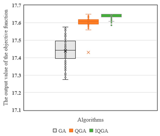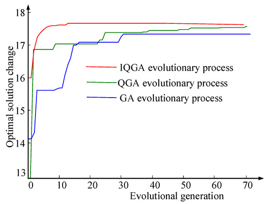 To assess the effectiveness of the IQGA, it was tested against typical nonlinear functions, with its performance being compared with those of the standard genetic algorithm (GA) and quantum genetic algorithm (QGA). The chosen nonlinear function (12) exhibits multiple local maxima within the specified range, whereas conventional optimization algorithms often oscillate between or become trapped in local maxima: