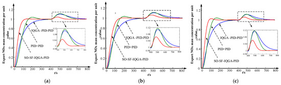Due to coal power units being increasingly used for deep load cycling, these units frequently require significant load adjustments. To assess the control performance of the SO-SF-IQGA-PID control scheme during extensive load variations, experiments were conducted across a load range from 340 MW to 540 MW. These tests included both load increasing and load decreasing scenarios. In conjunction with the ultra-low emission standard, the concentration of NOX was maintained at or below 50 mg/Nm3. Consequently, a step input signal of 50 mg/Nm³ was applied at t = 0. The dynamic characteristic curves for the load lift and load drop control under the three schemes are illustrated in Figure 12.