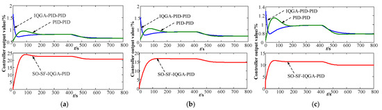 To assess the effectiveness of the algorithms while considering the operability of the actuators, the outputs of the actual controllers shall be restricted to a range between 0 and 100. The outputs of the main controllers under the three schemes are depicted in Figure 11. As shown, the output range of the SO-SF-IQGA-PID is between 0 and 25, and the other two algorithms are also maintained within the 0–100 range, meeting the requirements of the actual actuators.