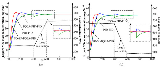 In Figure 12a, before 400 s, the unit was operating at a load of 340 MW. Beginning at 400 s, the load was increased until it reached 540 MW at 600 s. The figure clearly demonstrates that the SO-SF-IQGA-PID control scheme, as designed in this study, exhibited a minimal fluctuation of only 0.47% during the first model transition, significantly outperforming the other two schemes (3.4% and 7.8%). During the second model transition, this algorithm ensured that there were no fluctuations in the system output, indicating superior adaptability. The other two schemes still showed fluctuations of 0.64% and 1.9%. Additionally, this algorithm adjusted more rapidly and was able to quickly stabilize at the set value of 50 mg/Nm3, thereby significantly improving the control quality. In Figure 12b, before 400 s, the unit was operating at a load of 540 MW. Starting at 400 s, the load was reduced until it reached 340 MW at 600 s. The control scheme under discussion demonstrated the smallest fluctuations during the model transition and was the quickest to adjust. It is evident that a rapid response speed and precise controllability would significantly enhance the safe and efficient operation of coal-fired units, while allowing the effective management of the reduction of pollutants.