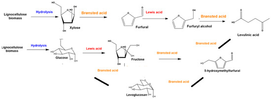 Lignocellulosic biomass consists of three main components: lignin, cellulose, and hemicellulose. Acidic hydrolysis can remove lignin, leading to the production of saccharide monomers with either six or five carbon atoms, such as glucose, xylose, levoglucosan, and fructose [18]. When lignocellulosic biomass breaks down into hexose sugars like glucose or xylose, these can be converted into levoglucosan or isomerized into fructose, which subsequently yields levulinic acid (as shown in Figure 1). Conversely, when the biomass breakdown results in pentose sugars, compounds such as furfural or furfuryl alcohol can have their five-membered rings cleaved to produce levulinic acid (refer to Figure 1) [19].