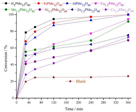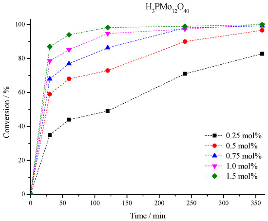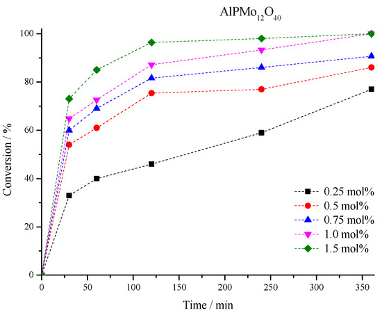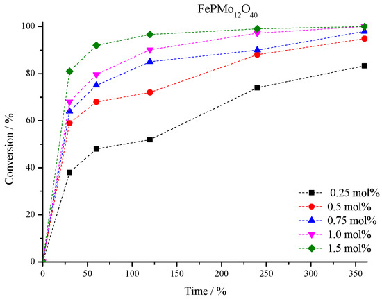 The reactions with AlMo12O40 catalysts or FeMo12O40 catalysts had comparable activity. However, the conversions of the reactions using the four higher loads of the FeMo12O40 catalyst were slightly better than those achieved in the AlMo12O40-catalyzed reactions (refer to Figure 6 and Figure 7). Furthermore, the same experiment was also conducted using the H3Mo12O40 catalyst (see Figure 8).