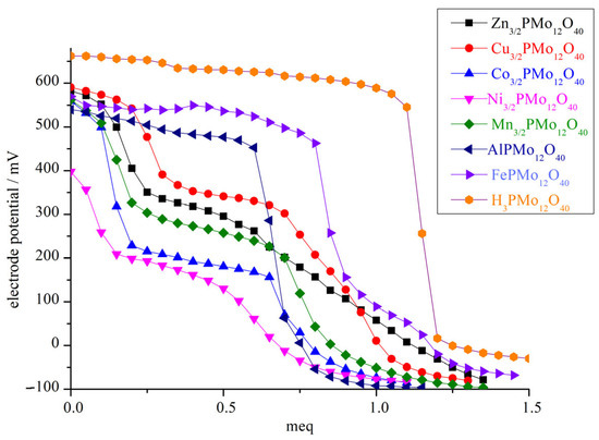 The strength of the acid sites of catalysts can be estimated from the initial electrode potential (Ei) of their solutions. According to Pizzio et al., the acidic sites of the phosphomolybdic acid and their metal salts can be classified as being very strong (Ei > 150 mv) [42]. Heteropoly salts of Fe3+, Al3+, and Cu2+ presented high Ei values, which were only lower than that of pristine heteropolyacid (H3Mo12O40).