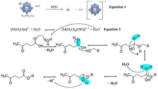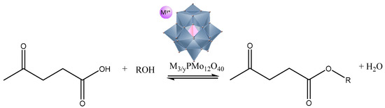 After the metal phosphomolybdate dissolves, it releases metal cations into the solution (see Equation (1) and Figure 4). These metal cations can then react with water molecules in the reaction medium, leading to hydrolysis and the release of H+ cations. The H+ cations act as catalysts in this process. They react with the carboxyl group of levulinic acid, protonating its carbonyl group. This makes the carbonylic carbon more electron deficient and more susceptible to the nucleophilic attack of the hydroxyl group of alcohol. Subsequent prototropism steps lead to water loss and the formation of levulinate ester, regenerating the H+ cations.