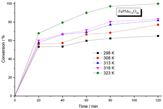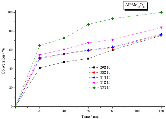 Likewise, as verified with the AlMo12O40 catalyst, the reactions performed at higher temperatures were faster and achieved higher conversions (Figure 10).