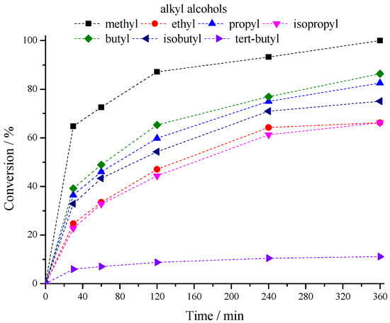 The reactivity of alcohols with different carbon chain lengths and hydroxyl groups was evaluated. Kinetic curves from the FeMo12O40 or AlMo12O40-catalyzed reactions of levulinic acid esterification with these alcohols were obtained. Figure 11 displays the results obtained using the AlMo12O40 catalyst.