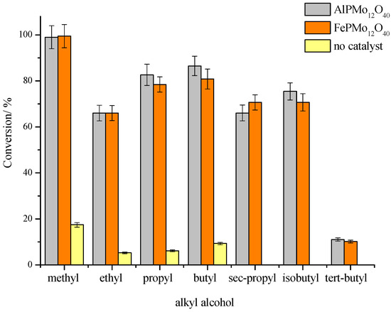 Despite excess alcohol, only poor conversions were achieved in reactions with more reactive alcohols, secondary and tertiary alcohol were not esterified in the absence of a catalyst. Conversely, once more, AlMo12O40 and FeMo12O40 catalysts had a very similar performance, regardless of alcohol.