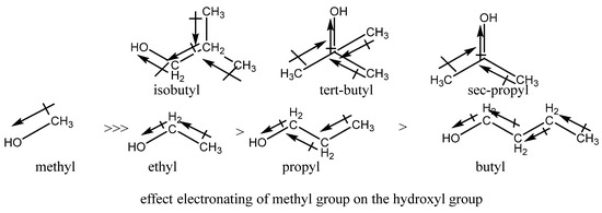 Methyl alcohol was found to be the most reactive in the reaction. This is because the first step of the reaction involves the hydroxyl group attacking the carbonyl of the carboxyl group in levulinic acid. This higher reactivity can be attributed to the electron-donating effect of the methyl group on the hydroxyl group. This effect decreases as the distance increases. In Scheme 2, it is shown how the carbon attached to the hydroxyl group can undergo an electron-donating effect, leading to an increase in the nucleophilicity of the hydroxyl group.