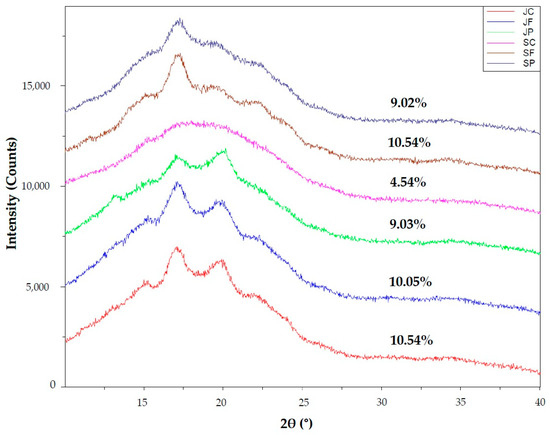 | Water uptake ratio (g/g) | 1.53 ± 0.05 c | 1.87 ± 0.03 b | 2.12 ± 0.16 a | 2.03 ± 0.07 a | 1.48 ± 0.03 b | 1.45 ± 0.02 b |