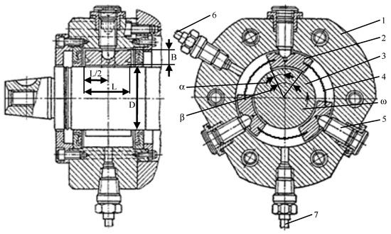 The principal construction of tilting pad bearing with elastic elements between tilting pads: L—tilting pad width; D—rotor diameter; 1—body; 2—tilting pads; 3—rotor; 4—elastic element; 5—adaptive restraint; 6—oil drain nozzle; 7—oil inlet nozzle.