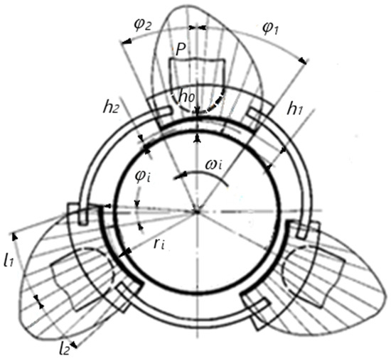 Tilting pad bearing calculation scheme: P—pressure; h0, h1, h2—oil film thicknesses; φ1, φ2—tilting pad angles; l1, l2—tilting pad lengths; ri—radius; φi—angle; ωi—rotor angular speed.