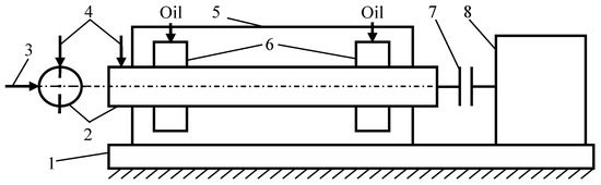 The principal experimental stand scheme: 1—base; 2—rotor; 3—horizontal non-contact transducer of measuring; 4—vertical non-contact transducer of measuring; 5—housing of rotor system; 6—tilting pad bearings; 7—muff; 8—electrical motor.