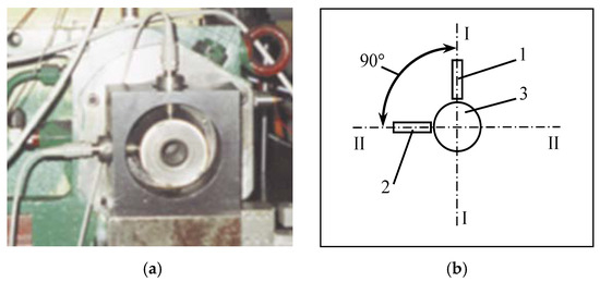Experimental stand: (a) photograph; (b) principle scheme of the arrangement of measuring transducers: I–I—position of vertical; 1—vertically mounted non-contact transducer; II–II—position of horizontal; 2—horizontally mounted non-contact transducer of measuring; 3—rotor.