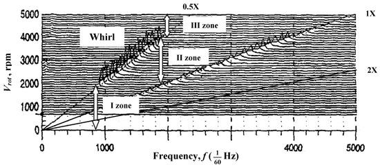 From the spectrogram-cascade graph (Figure 6), it can be seen that the rotor rotates steadily from 0 to 1938 rpm (I zone). When exceeding 1938 rpm, spontaneous vibrations of the rotor appear, and that effect continues until the rotation speed reaches 3923 rpm (II zone). No spontaneous vibrations are observed when the rotor rotation is in the range 3923–5000 rpm (III zone).