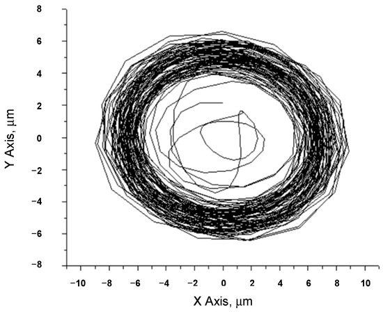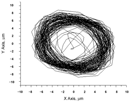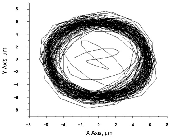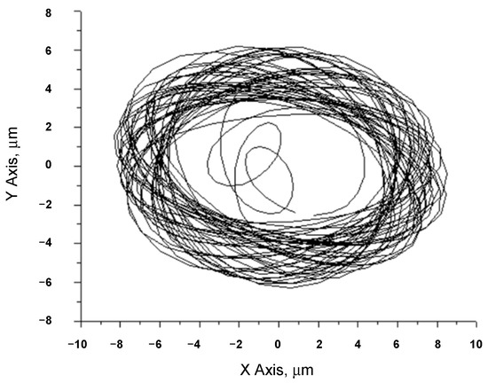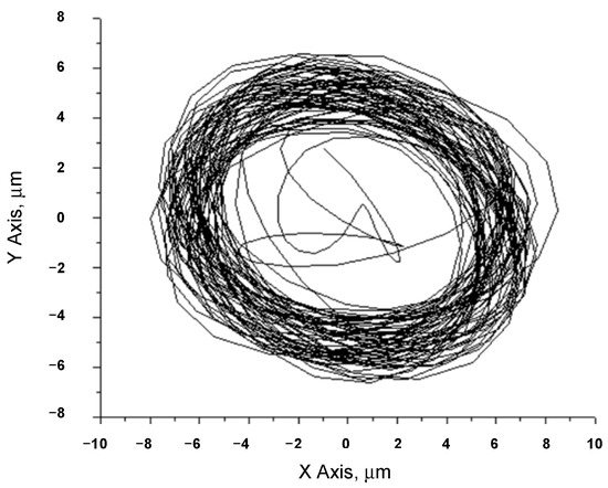 When the rotor rotation speed is 2000 rpm (Figure 8), the orbital form is irregular and chaotic because the range of oil whirl can reach up to 2500 rpm (Figure 9). Although the effect of oil whip is visible, the orbit slightly stabilizes and its form begins to approach a regular circle. When the rotor rotation speed is 3000 rpm (Figure 10), the form of the orbit is unstable and irregular; beyond the resonant frequency, the orbit starts to stabilize again, which can be viewed in the rotor rotation speed orbit at 3500 rpm (Figure 11). At the end of a zone of whirl and with rotor rotation at 4000 rpm (Figure 12), the orbit is further approaching an ideal circle form and the thickness of the outer ring of the orbit decreases.