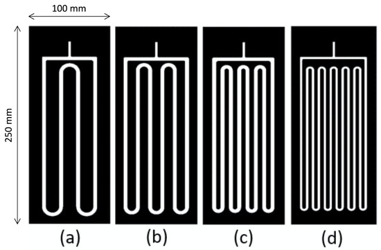 Prototype pulsating heat pipes with 3-turn (a), 5-turn (b), 7-turn (c), and 11-turn (d) serpentine channels. The meandering channel has a rectangular cross-section with a 0.7 mm thickness and widths of 5 mm (3 turns, 5 turns, and 7 turns) and 3 mm (11 turns).