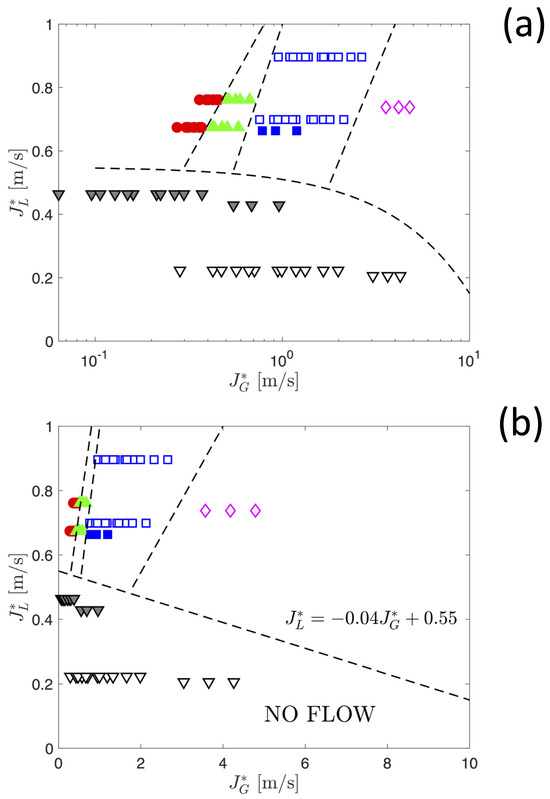 Empirical flow pattern map for a flat-plate pulsating heat pipe based on the virtual superficial velocities of the liquid and vapour phase in semilogarithmic coordinates (a) and linear coordinates (b). (▽): No flow; (◯): bubbles or bubbles and plug flow; (△): bubbles and churn flow; (□): bubbles, plug/slug, and churn flow; (⋄): bubbles, slug, and annular flow. Filled symbols indicate experiments carried out using ethanol, while open symbols correspond to experiments carried out using perfluorohexane FC-72. Discontinuous lines are provided as a guide to the eye to identify empirical transition boundaries between different flow patterns.