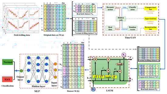 To address the challenges of binary classification under imbalanced small sample conditions, this paper constructs an intelligent kick detection model based on TimeGAN for kick time-series data augmentation, LSTM for multidimensional time-series feature extraction, and MLP for downhole condition classification. The model framework is shown in Figure 1. The model consists of three main components: the sample augmentation module (TimeGAN), the feature extraction module (LSTM), and the condition classification module (MLP). The model’s workflow is illustrated in Figure 2. First, we preprocess the real drilling data collected from the field to obtain the original dataset M(a). Then, we divide the original dataset into a kick dataset NP and a normal drilling dataset NN. Based on the real kick dataset NP, we generate a certain amount of artificial kick samples using the TimeGAN, forming the augmented kick dataset N(C). After mixing the kick dataset NP, the normal drilling dataset NN, and the augmented kick dataset N(C), we feed the mixed dataset into the feature extraction module. We utilize LSTM networks, which excel in handling time series problems, for feature extraction and the dimensionality reduction of the mixed dataset, to obtain the deep data features of surface multidimensional parameters. Finally, we use cross-validation to divide the mixed dataset into training and testing datasets and input the training dataset into the MLP for model classification training. After training, we test the model’s performance using the test dataset. In this process, the k-fold cross-verification strategy is applied.