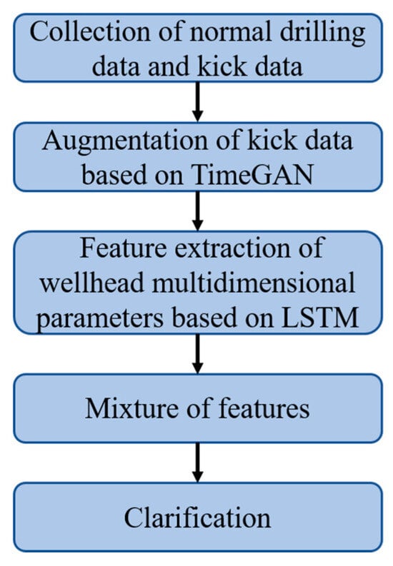 The main process of kick data augmentation using the TimeGAN algorithm is as follows: (1) Collect and organize real kick data from actual drilling operations. (2) Set the model training parameters and input the organized real kick sample data into the TimeGAN for training. (3) Minimize reconstruction and supervised and unsupervised losses, thereby capturing the temporal characteristics of the kick data and generating random synthetic kick data.