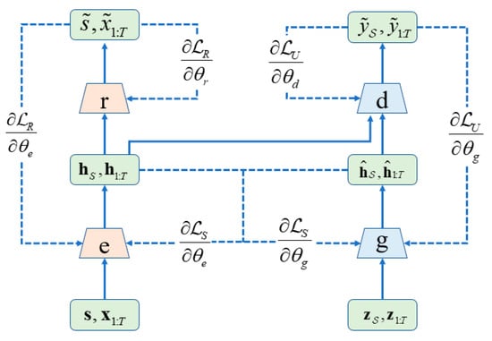In addition to the adversarial module of a traditional GAN, TimeGAN incorporates an autoencoder module (embedding network and recovery network), which enables reversible mapping between the feature space and the latent space. The embedding and recovery functions have the capability to reconstruct latent features from the hidden features (hS, h1:T) of the original data (S, X1:T). Therefore, the reconstruction loss of the objective function (Equation (1)) is expressed as follows: