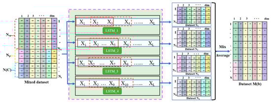 The time-series feature extraction model for surface drilling parameters based on the LSTM network, as shown in Figure 5, transforms the original time series data from an NL*8 matrix into a vector with the dimension 1*dL. This representation captures the variation patterns of the surface drilling parameters while reducing the dimensionality of the dataset (i.e., decreasing the number of feature parameters input into the subsequent modules). The model employs four sliding windows of different sizes (with time steps of 3, 5, 7, and 9, respectively) to extract features from the real drilling time series data. These capture multivariate time-series features over different time ranges, resulting in four corresponding time-step-based time-series feature datasets of N1, N2, N3, and N4. These four feature datasets are then fused, summed, and averaged to obtain the final time-series feature dataset M(b), which contains features from both the kick data and normal drilling data.