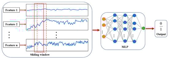 MLP is employed in this study to perform the final downhole condition classification task. MLP is a deep learning model based on a feed-forward neural network []. It is widely used to solve problems such as classification, regression, and clustering. An MLP consists of an input layer, hidden layers, and an output layer. The input layer is responsible for receiving external input features and providing data to the neural network, while the hidden layers optimize the network. The MLP forms a chain-like network structure by combining two or more functions layer by layer. The length of the chain is referred to as the depth of the network. The most common network structure involves connecting the first layer f(1), the second layer f(2), and the output layer g to form a chain , mapping the input data x to a category. represents the feature matrix for n samples, where each sample has d input features. represents the MLP, with a single hidden layer containing h hidden units. Since both the hidden layer and output layer are fully connected, the hidden layer has the weights and biases , while the output layer has the weights and biases . The output of the single hidden-layer MLP is expressed as follows: