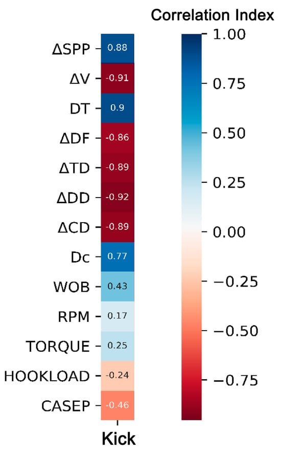 Correlation analysis of the input parameters. (ΔSPP—SPP difference, ΔV—mud pit increment, DT—drilling time, ΔDF—inlet/outlet flow rate difference, ΔTD—inlet/outlet mud temperature difference, ΔDD—inlet/outlet mud density difference, ΔCD—inlet/outlet mud conductivity difference, Dc—Dc exponent, WOB—weight on bit, RPM—revolution per minute, CASEP—casing pressure).