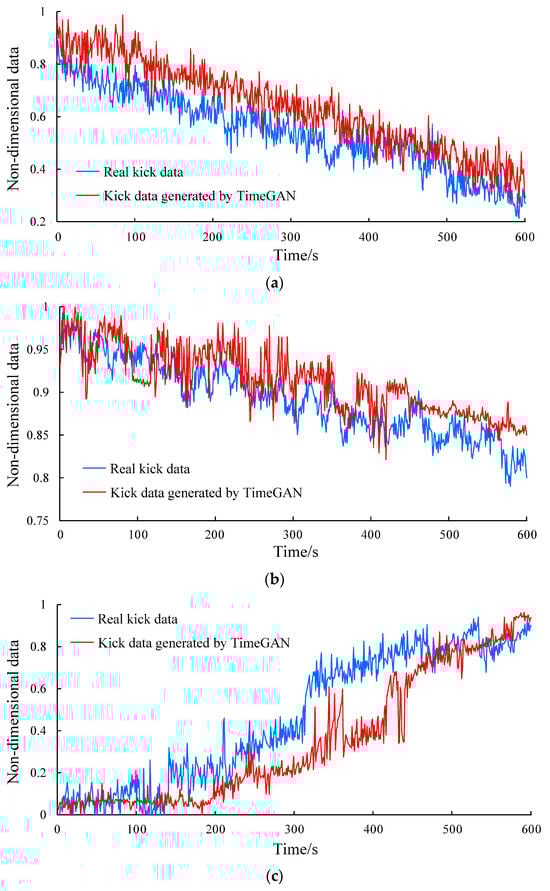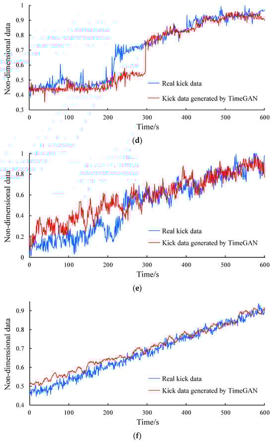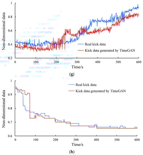 Figure 8a–h shows a set of preprocessed real kick data and a set of kick data generated by the TimeGAN data augmentation method (the blue curves represent real kick data, and the red curves represent generated data). Graphically presenting the results of both TimeGAN-generated and actual data offers unique advantages for evaluating the quality of the synthetic data, particularly when dealing with time series data. Visualizations allow the researcher to directly observe how well the generated data replicate temporal patterns, trends, and feature relationships that are present in the actual data. Unlike a single evaluation metric like R2, which captures overall fit, visual comparisons can reveal nuances such as the alignment of peaks and valleys, continuity in sequences, and other subtleties that contribute to the model’s realism. It can be observed that the kick data generated by TimeGAN exhibits similar characteristics and patterns to those of real kick data. Compared to traditional oversampling and undersampling methods, TimeGAN-generated kick data do not simply replicate the existing data but add diversity to the kick dataset, which helps enhance the generalization ability of the kick detection model.