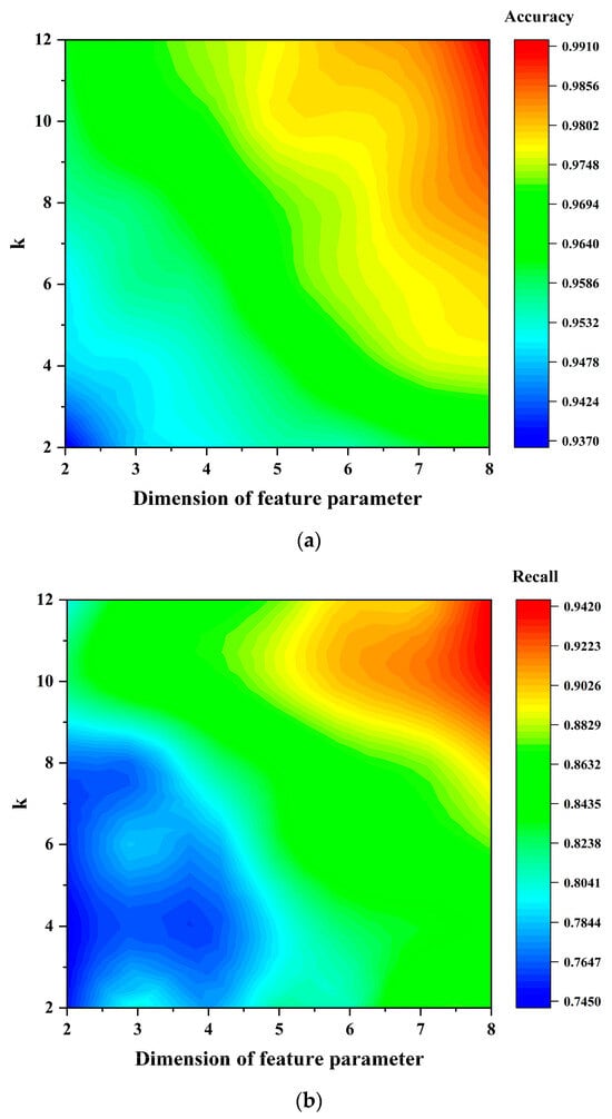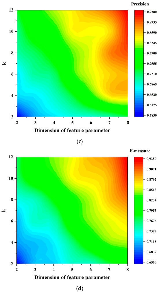 Evaluation metrics under different k and feature parameter dimensions. (a) Accuracy. (b) Recall. (c) Precision. (d) F-measure.